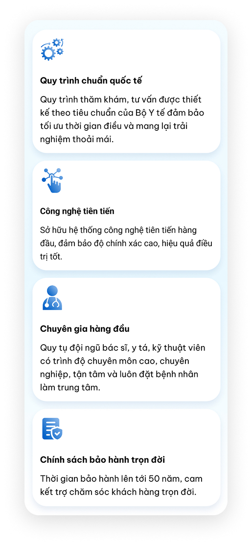 Với tầm nhìn chiến lược và nỗ lực không ngừng, ViDental cam kết mang đến dịch vụ chuẩn quốc tế, áp dụng công nghệ tiên tiến và duy trì chất lượng vượt trội. Đây là đơn vị đầu tiên áp dụng bộ 45 tiêu chuẩn Quốc tế AIFC - hệ quy chuẩn quốc tế về chất lượng dịch vụ, chuyên môn thăm khám và chăm sóc khách hàng.